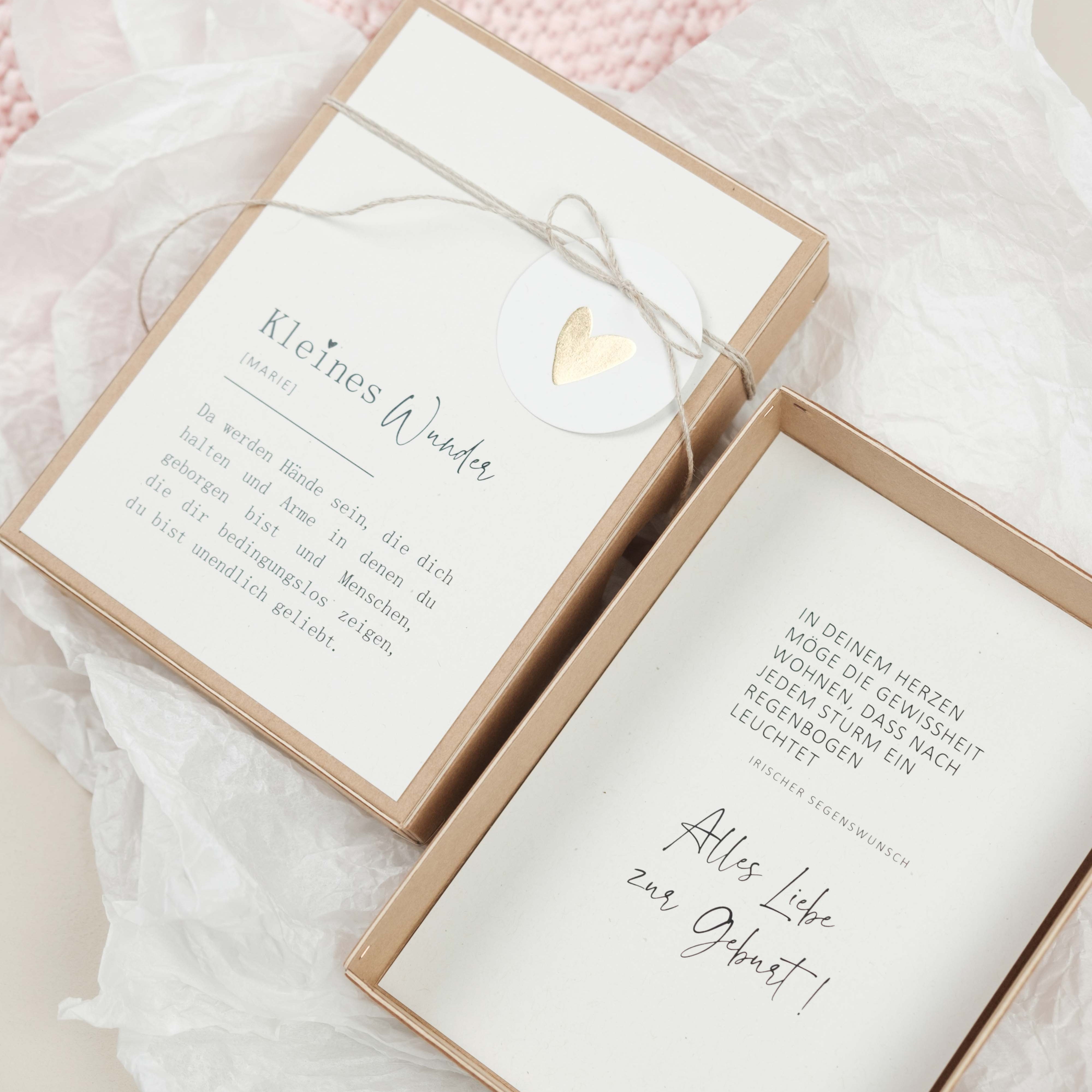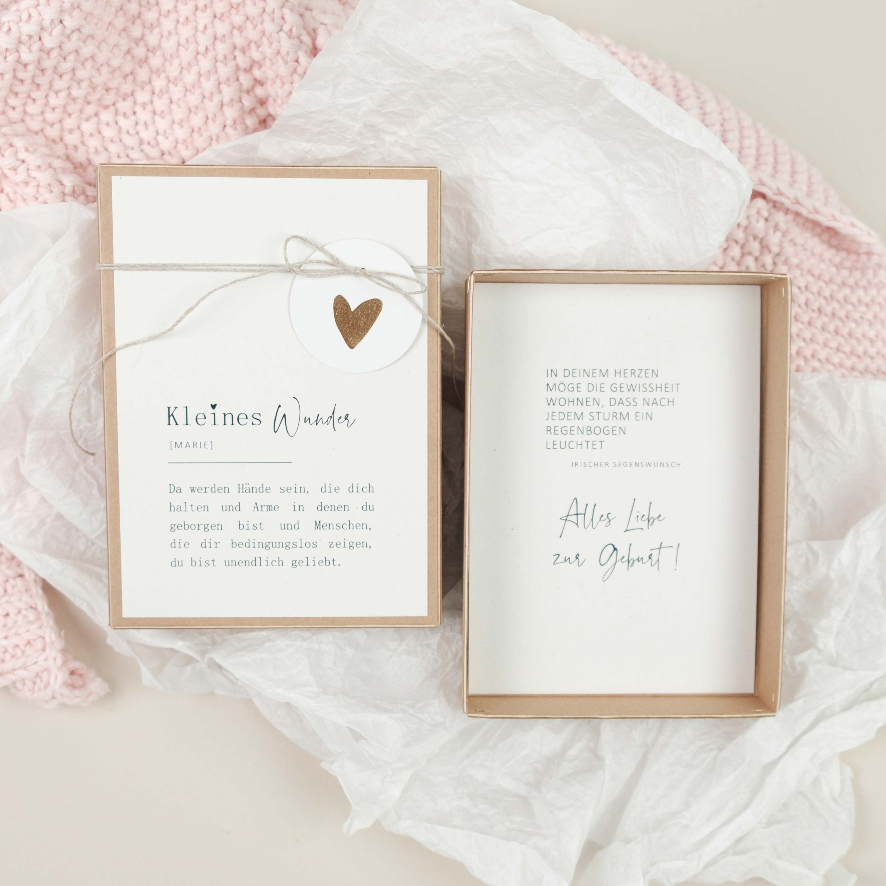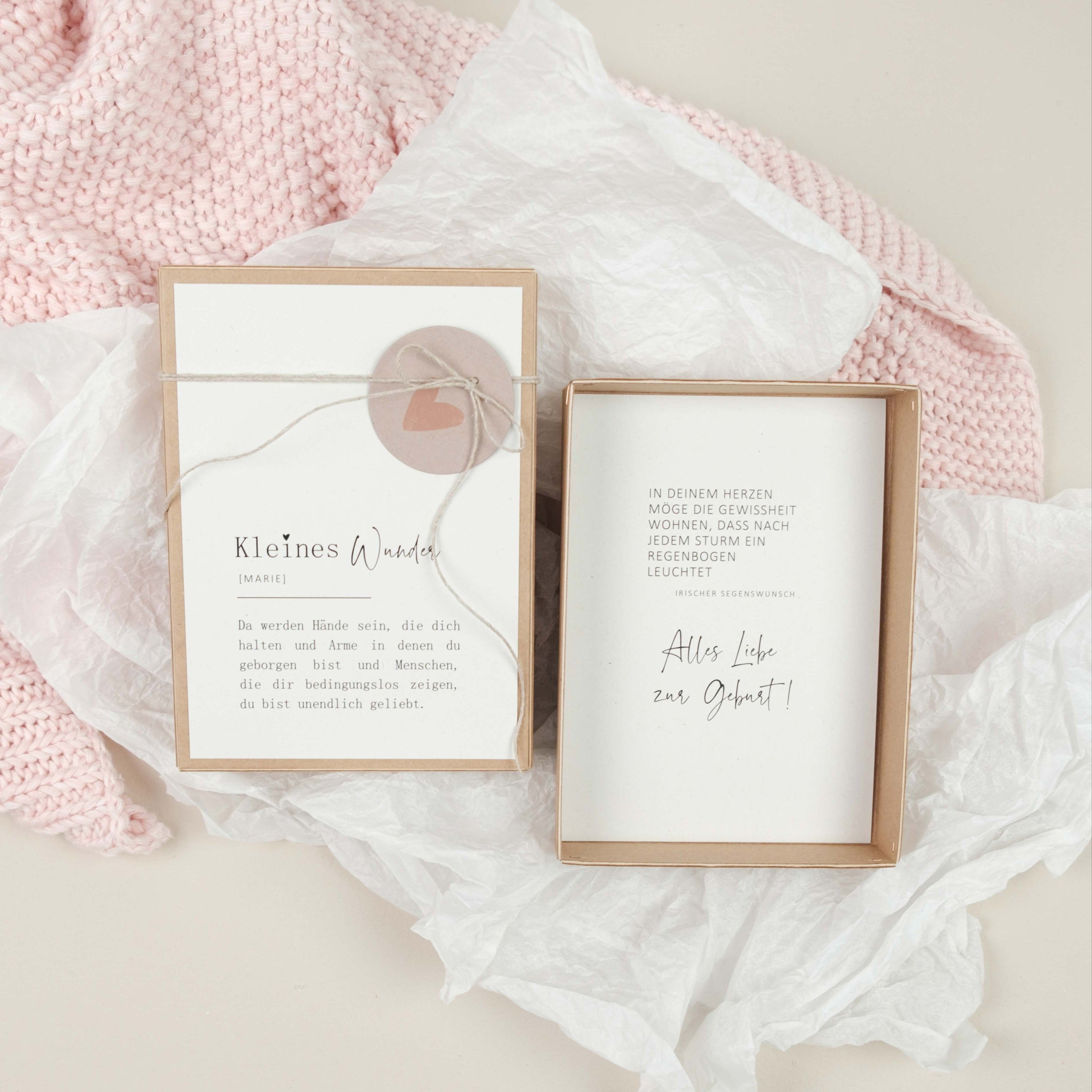 Auf dem cover der Box steht "Kleines Wunder". Darunter wird der Name des Kindes eingetragen.