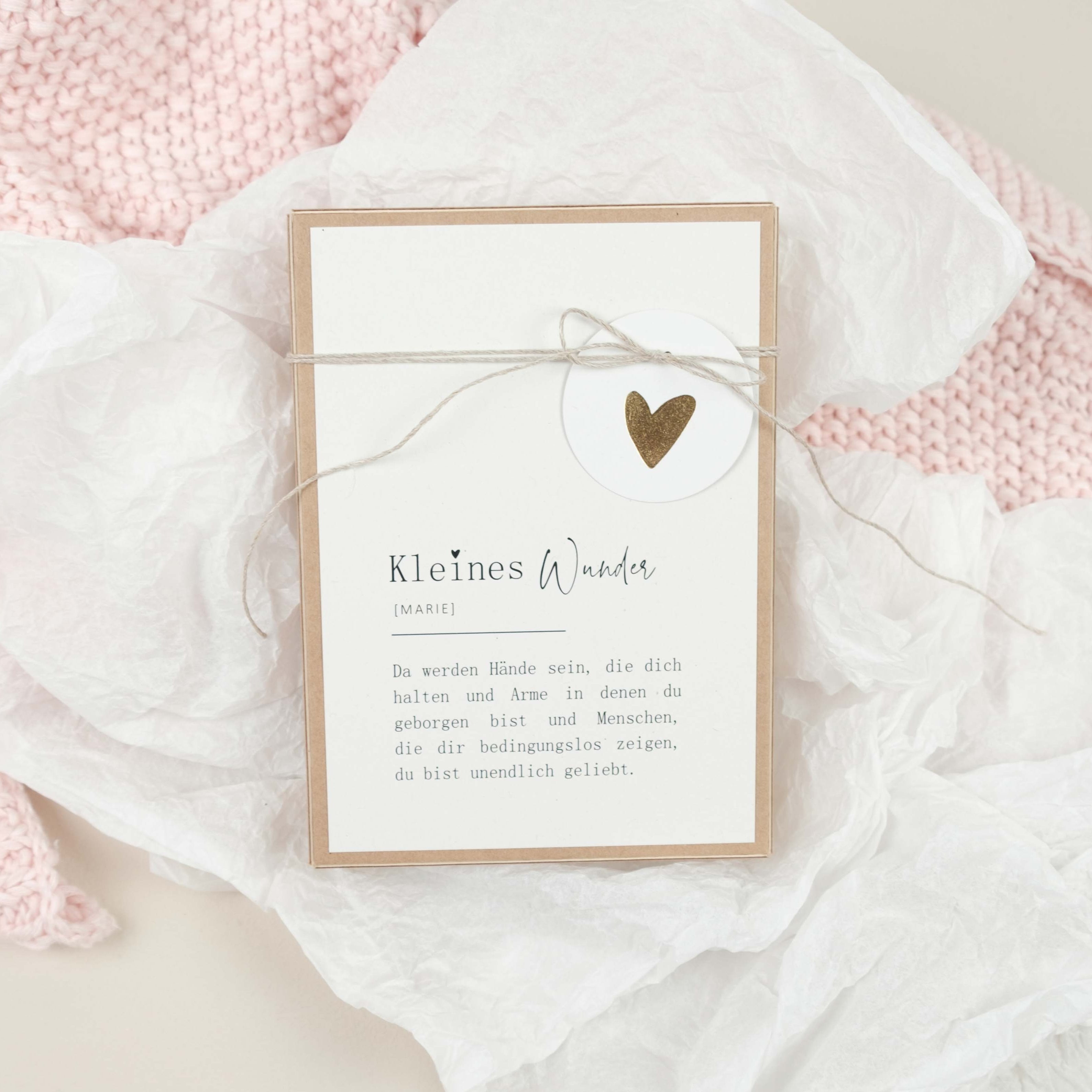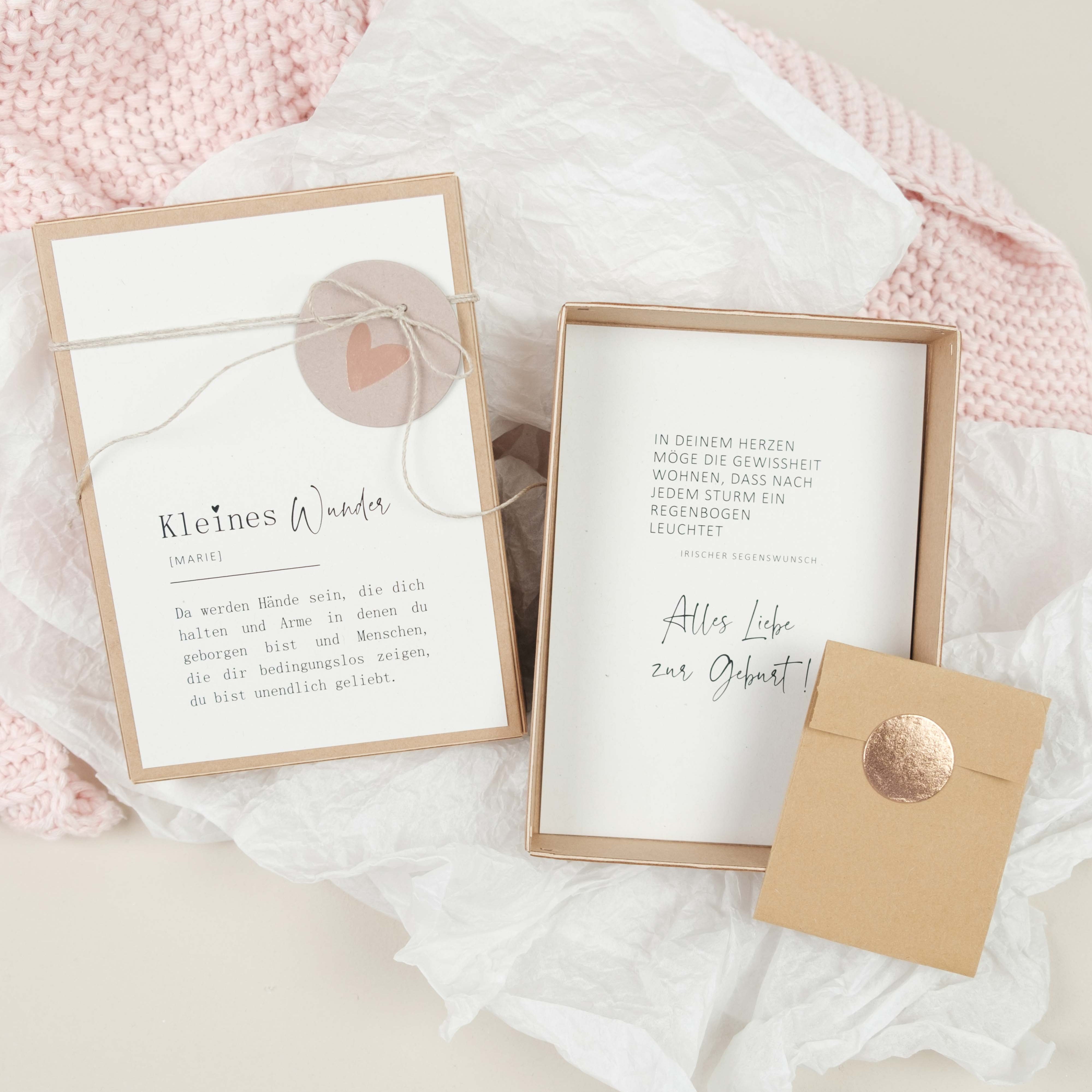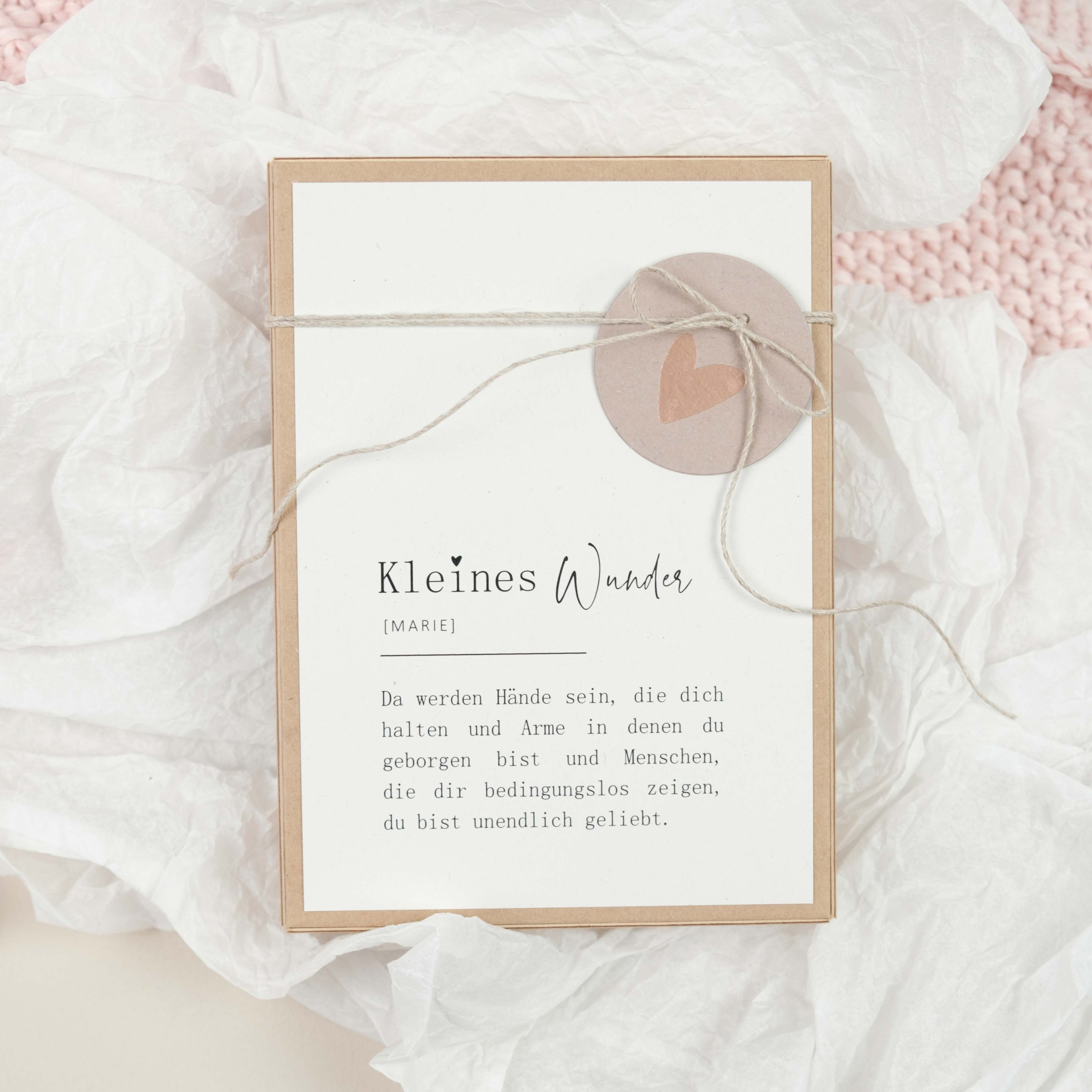 Auf dem cover der Box steht "Kleines Wunder". Darunter wird der Name des Kindes eingetragen.