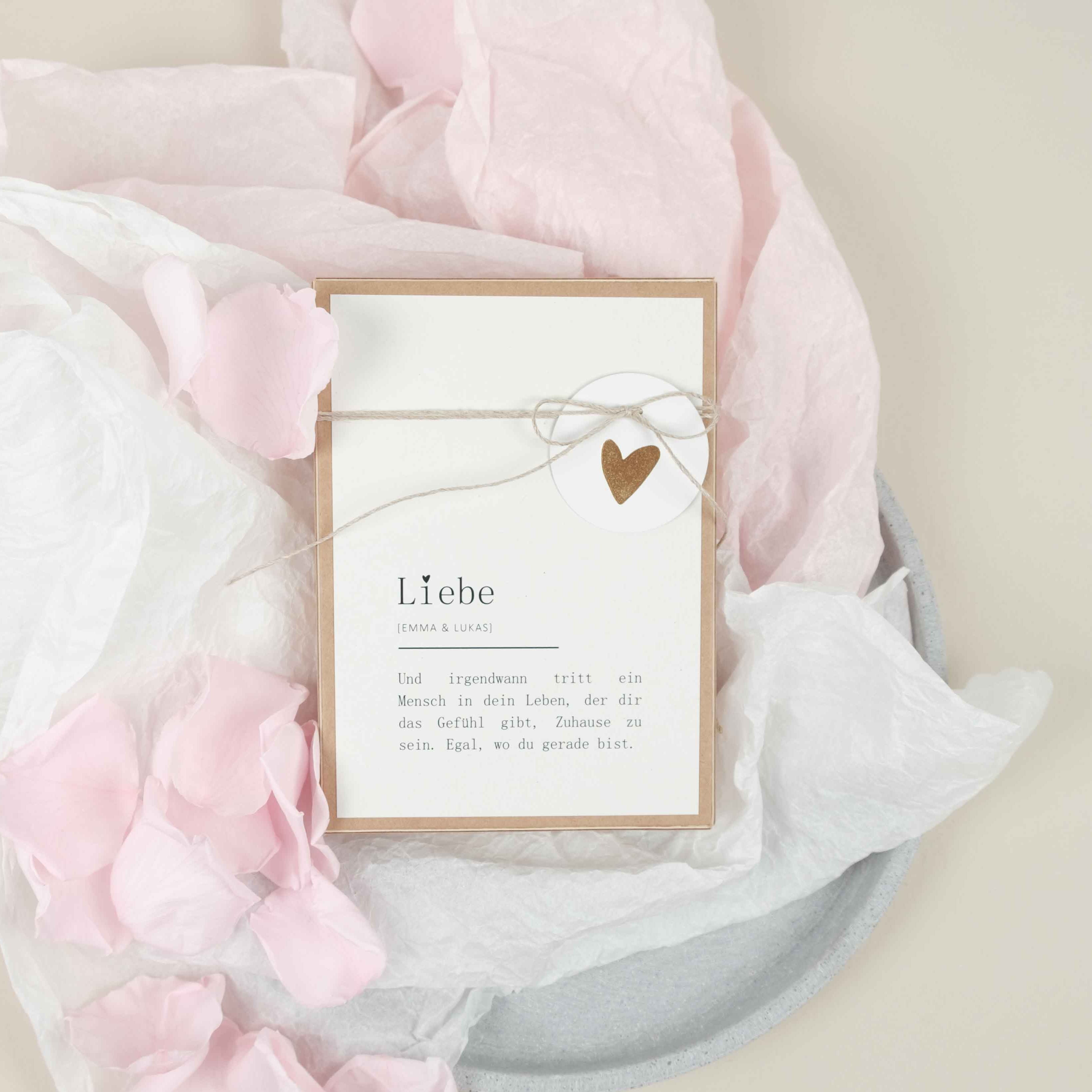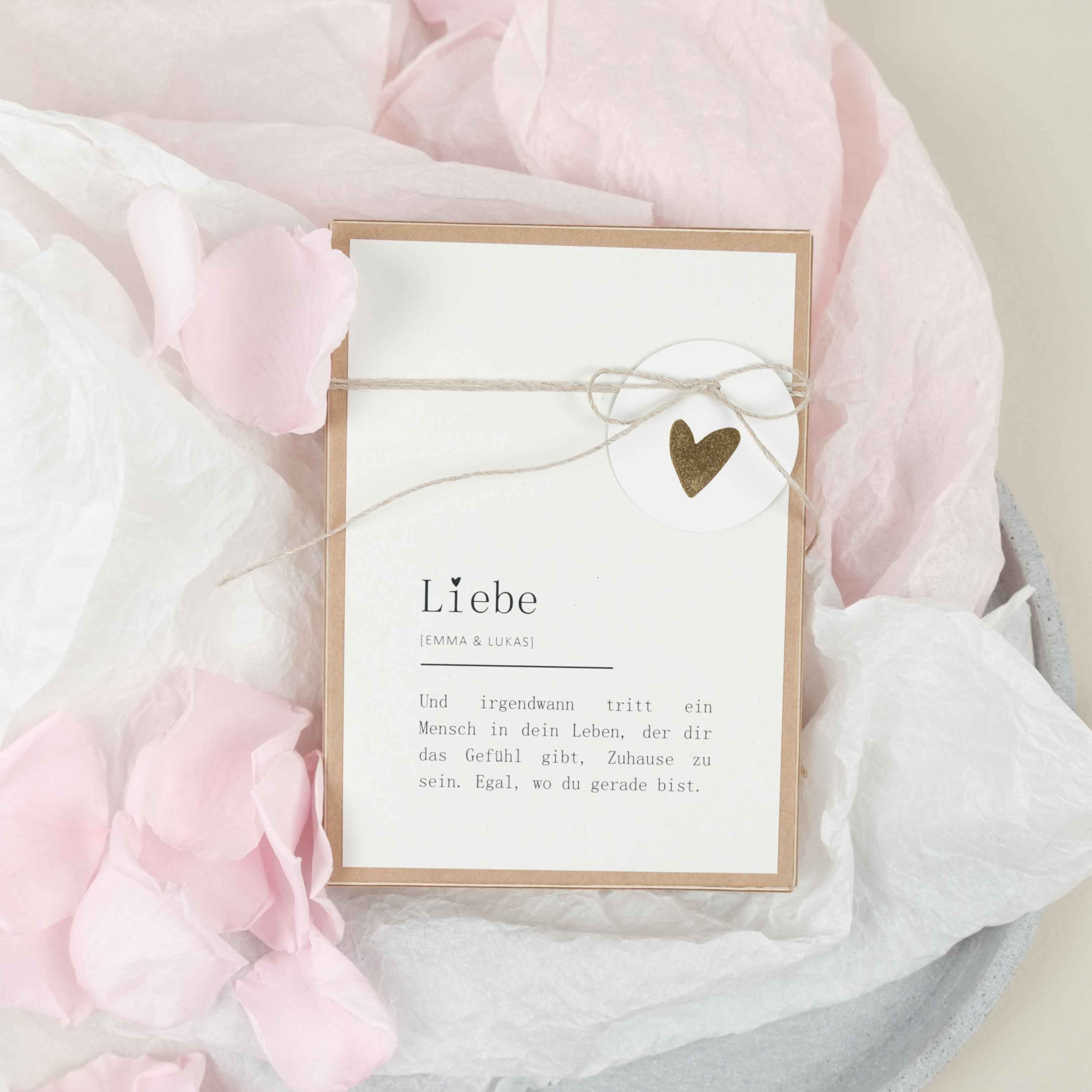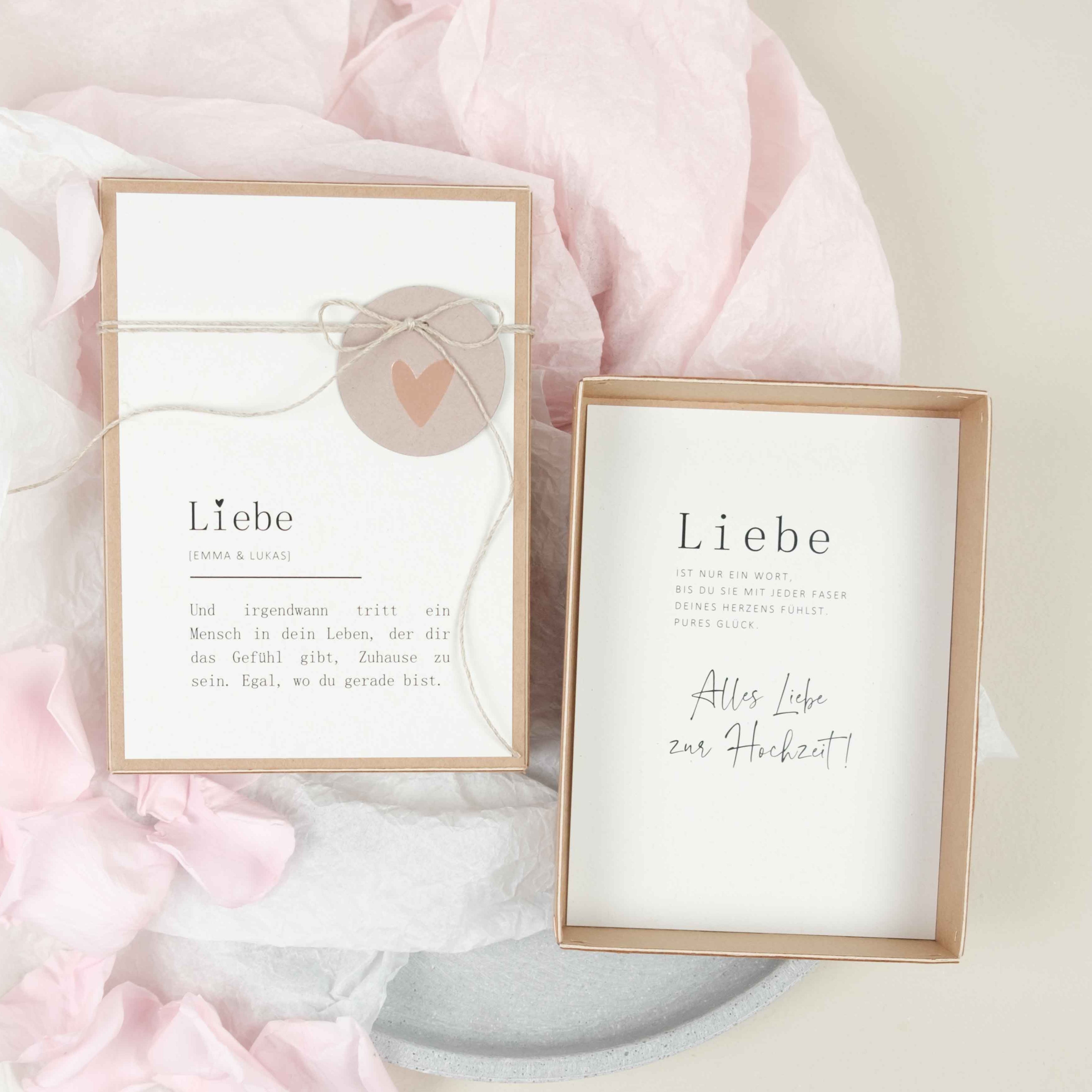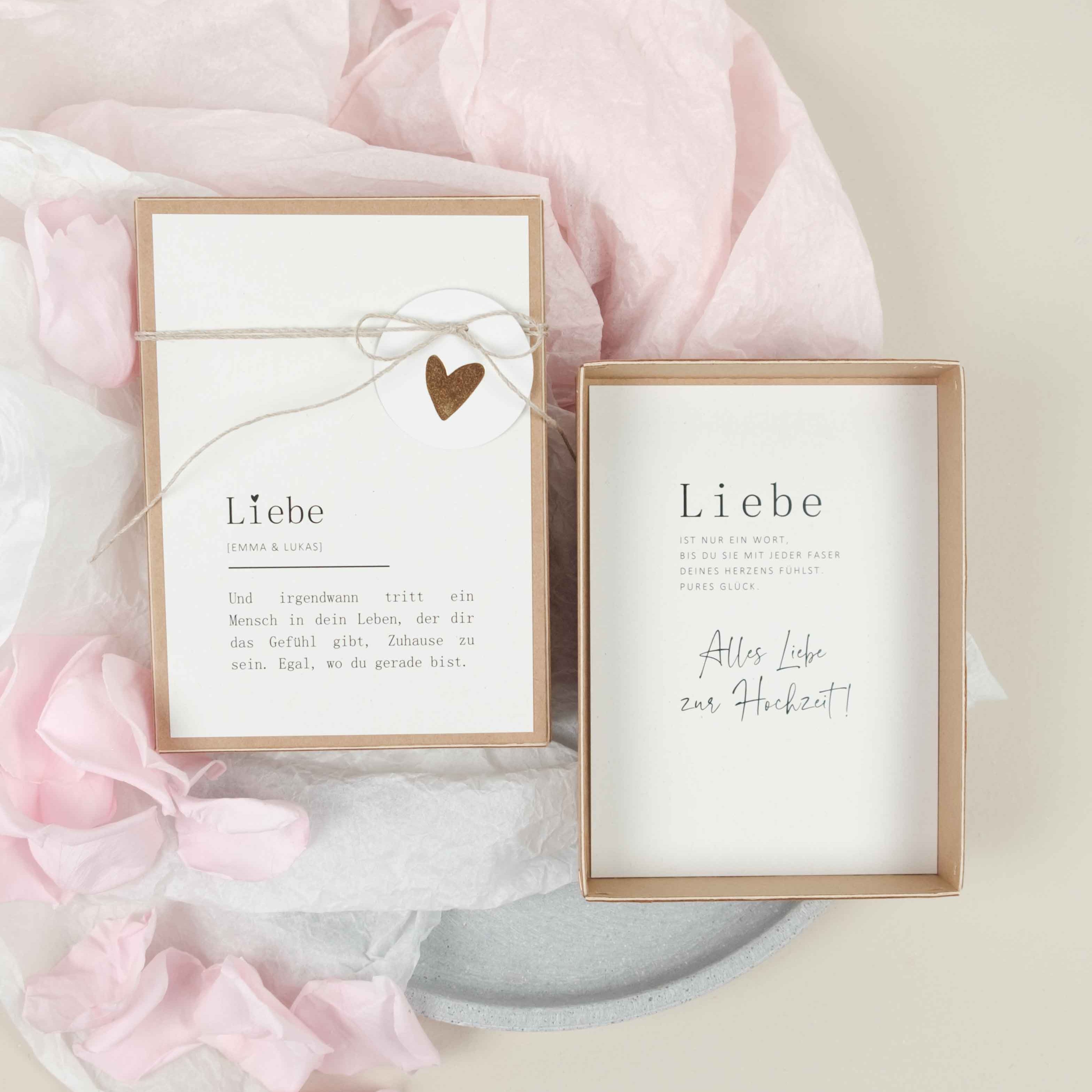 Auf dem cover der Box steht "Liebe" im Stil einer Definition. Darunter wird der Name von Braut und Bräutigam eingetragen.