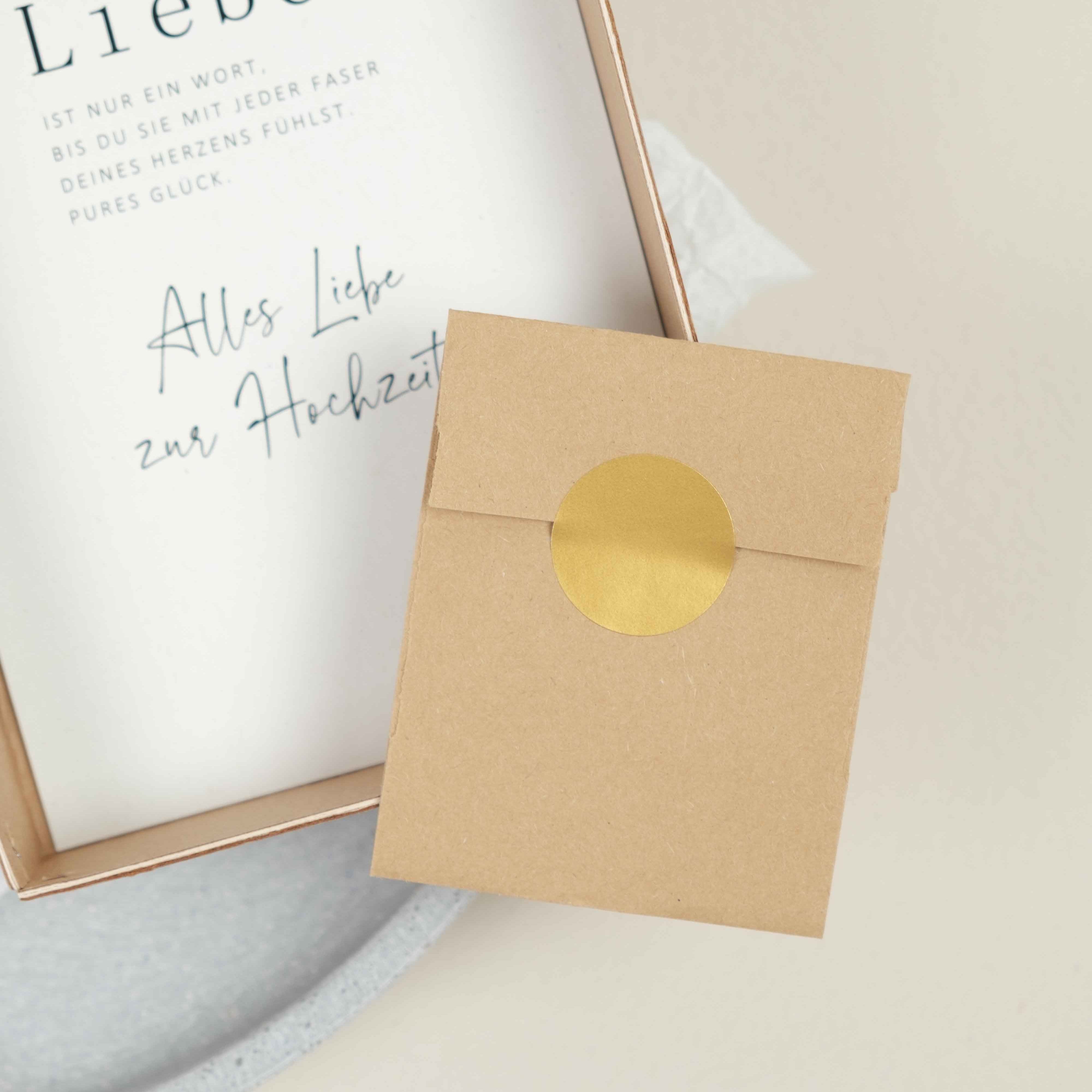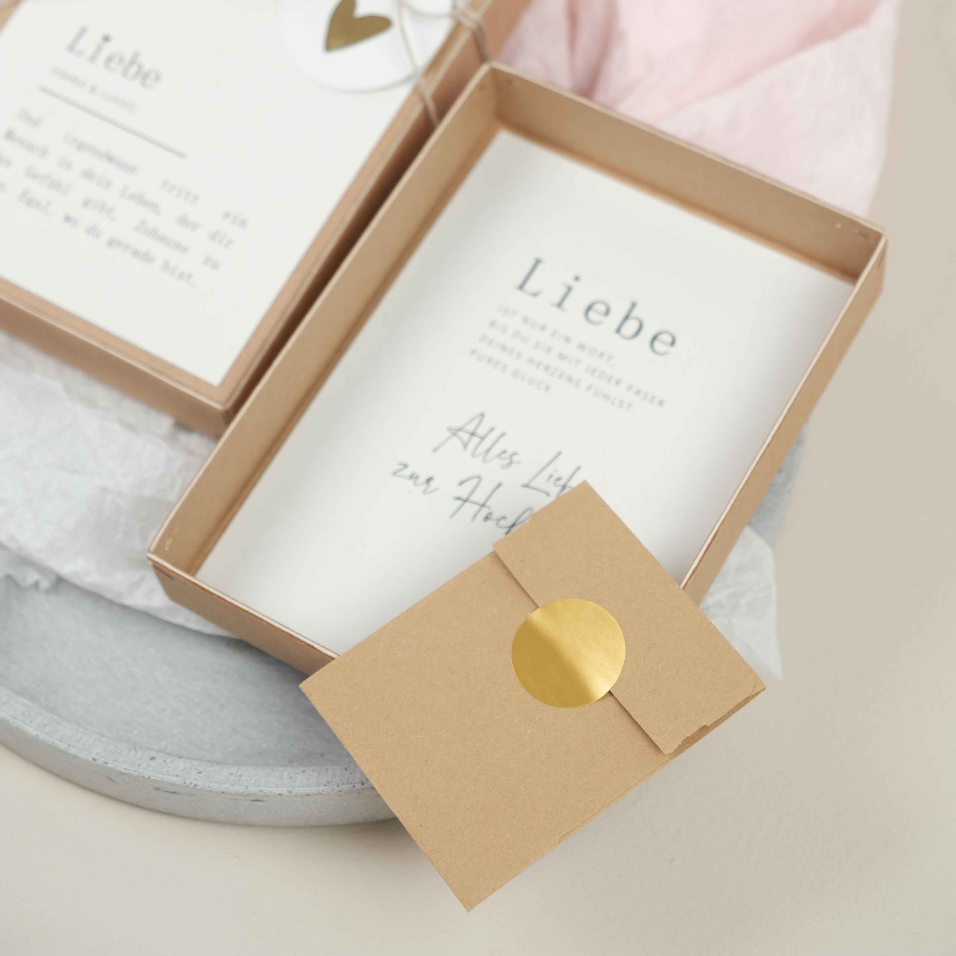 Deiner Box liegt ein kleines Tütchen aus Kraftpapier in der Größe 6x9cm bei, um darin dein Geldgeschenk zu verpacken und anschließend mit dem Aufkleber zu verschließen. So kannst du es in die Box legen und es ist elegant verpackt.