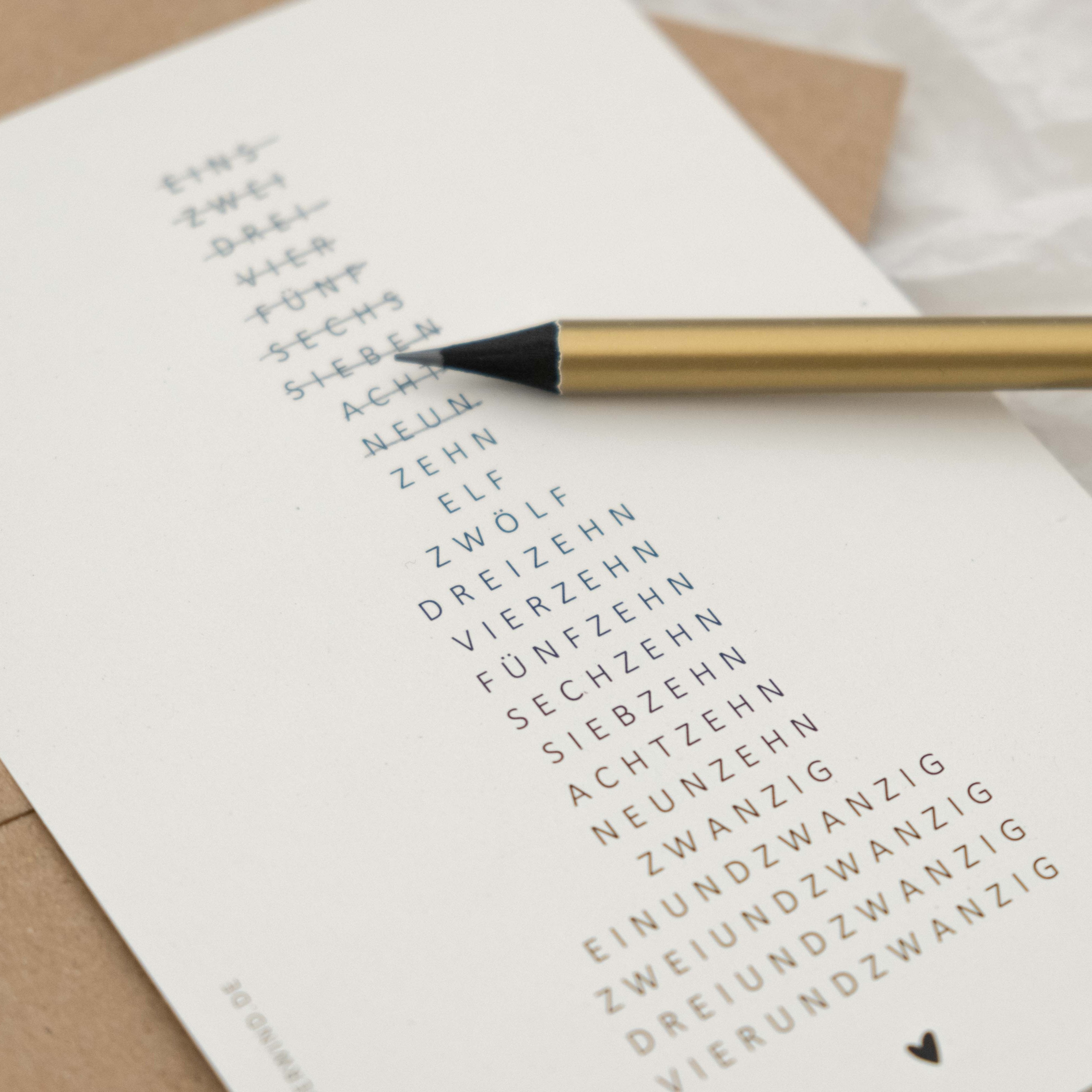 Die Karte ist im professionellen Digitaldruck im Postkartenformat A6 (105x148mm) auf 300g Recyclingpapier (Blauer Engel) in einem modernen hellen betongrau gedruckt.